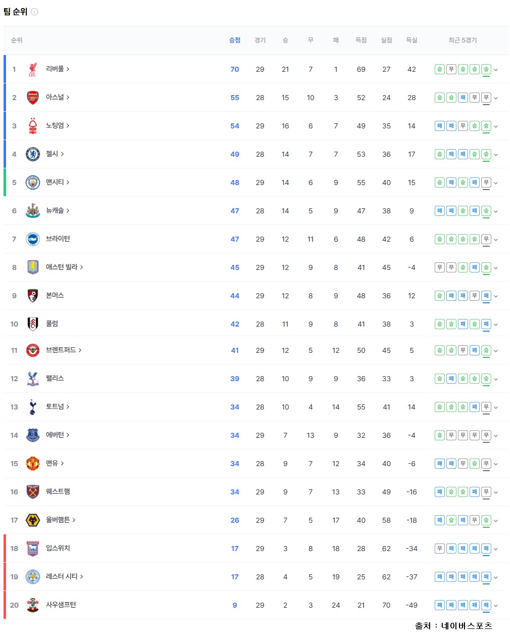 250316 현재 프리미어리그 팀순위